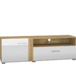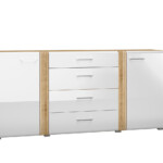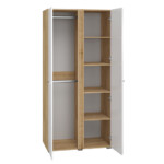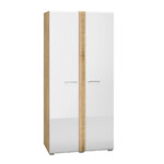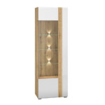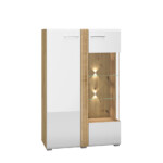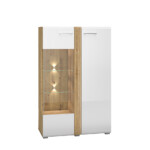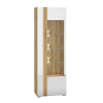 Biel frontów zestawiona z naturalną barwą korpusów tworzy połączenie, które dobrze wpisuje się zarówno w nowoczesne, jak i tradycyjne wnętrze. Gładka powierzchnia mebli oraz metalowe uchwyty odbijają światło, optycznie powiększając przestrzeń. Przeszklone, podświetlane witryny budują wyjątkowy nastrój we wnętrzu. Ryflowane wstawki o tym samym ciepłym odcieniu co korpusy nadają ciekawego wyglądu, a zaoblone ku górze fronty przełamują prostą linię kolekcji, wplatając nieco nowoczesnej klasyki.
