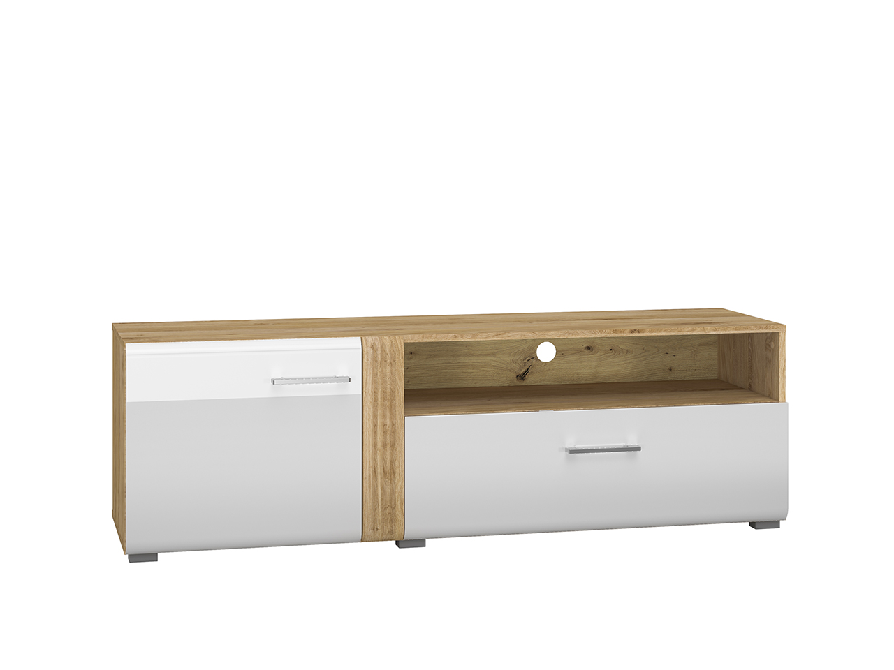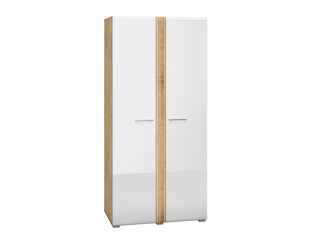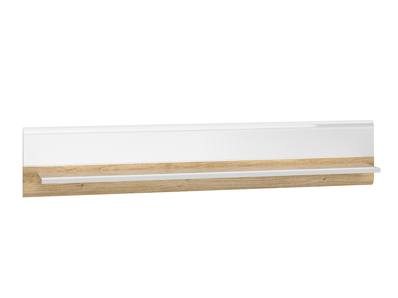 Biel frontów zestawiona z naturalną barwą korpusów tworzy połączenie, które dobrze wpisuje się zarówno w nowoczesne, jak i tradycyjne wnętrze. Gładka powierzchnia mebli oraz metalowe uchwyty odbijają światło, optycznie powiększając przestrzeń. Przeszklone, podświetlane witryny budują wyjątkowy nastrój we wnętrzu. Ryflowane wstawki o tym samym ciepłym odcieniu co korpusy nadają ciekawego wyglądu, a zaoblone ku górze fronty przełamują prostą linię kolekcji, wplatając nieco nowoczesnej klasyki.