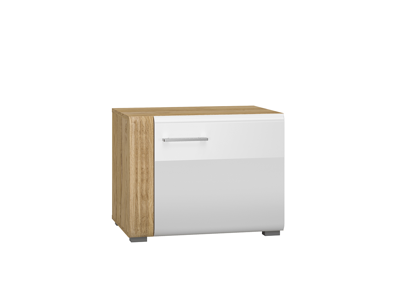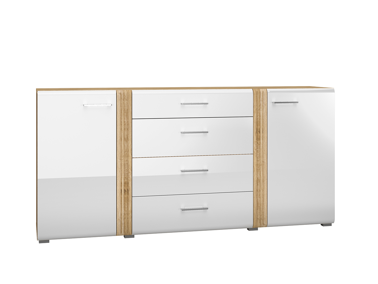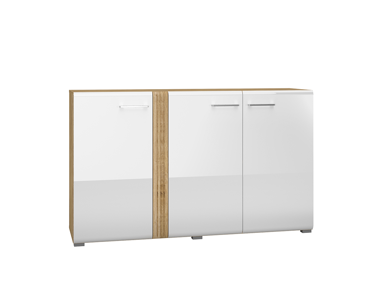 Biel frontów zestawiona z naturalną barwą korpusów tworzy połączenie, które dobrze wpisuje się zarówno w nowoczesne, jak i tradycyjne wnętrze. Gładka powierzchnia mebli oraz metalowe uchwyty odbijają światło, optycznie powiększając przestrzeń. Przeszklone, podświetlane witryny budują wyjątkowy nastrój we wnętrzu. Ryflowane wstawki o tym samym ciepłym odcieniu co korpusy nadają ciekawego wyglądu, a zaoblone ku górze fronty przełamują prostą linię kolekcji, wplatając nieco nowoczesnej klasyki.