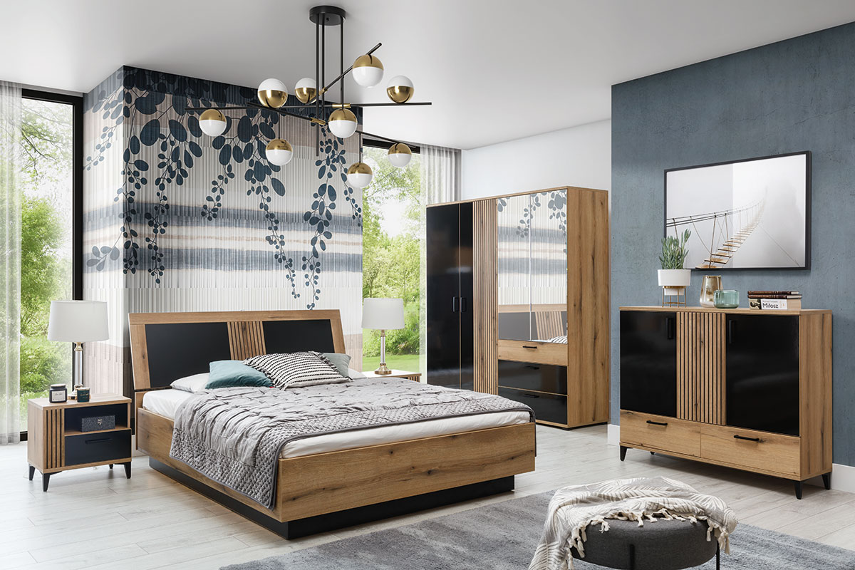 Na uwagę zasługują fronty w czarnym połysku, które w połączeniu z dekorem dąb evoke
