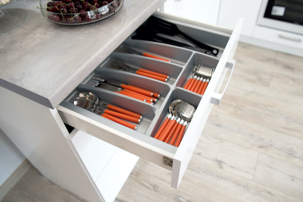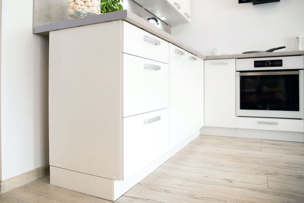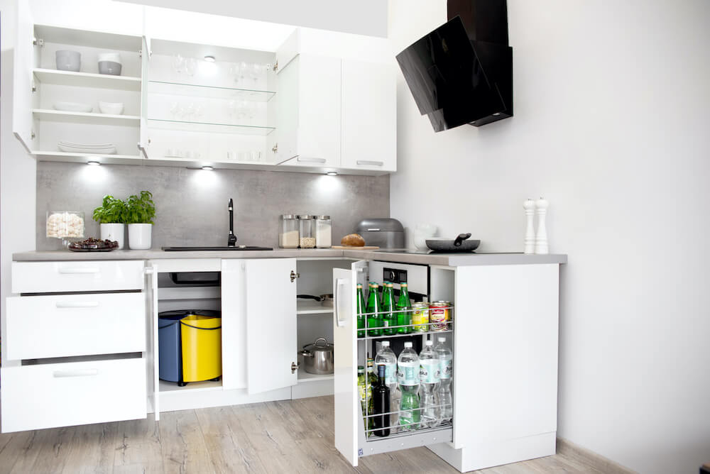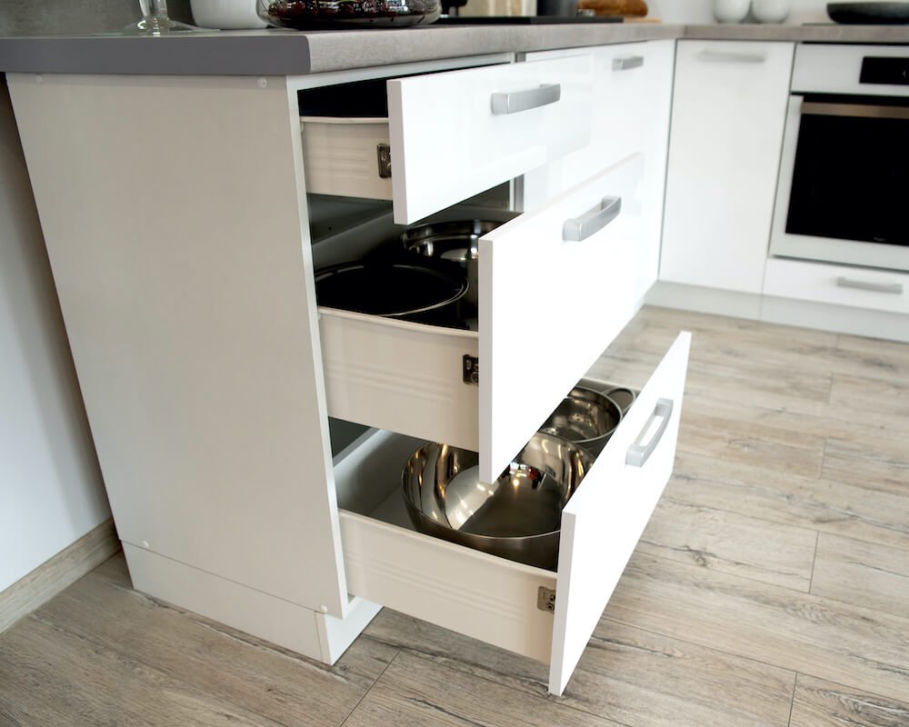 Fronty wykonane z płyty połyskoewj białej.Zaplanowanie i stworzenie oryginalnego projektu wymarzonej kuchni ułatwi wybór szafek z blisko 40 dostępnych modułów. W tym znajdują się szafki stojące pod zabudowę sprzętu AGD, szafki stojące z funkcjonalnym koszem cargo, słupek kuchenny oraz szafki wiszące z szybą.